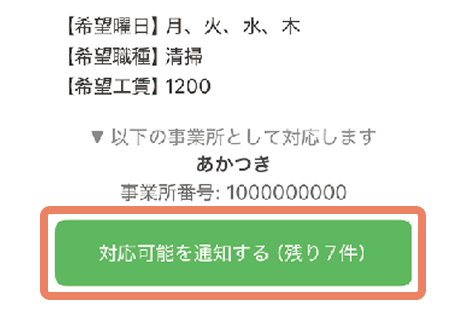 通知内容にある、対応可能ボタンを押すと事業所(紹介側)に通知が届きます。